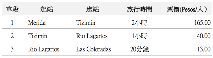 到Rio Lagartos,更精確的說要到粉紅湖所在的Las Coloradas,翻閱了網上的中英文資訊和攻略,幾乎所有人都是自駕前往,原本我們也想在Merida租一台車自己開過去,然後到下一個目的地Tulum還車,但這甲地借乙地還租車公司要多收110美金,考慮到最後還是作罷,想說還是試著搭大眾運輸工具看走走看,這一路換了三趟車,還真給我們走到了,而且交通費兩個人只花了436墨西哥Pesos,比起自駕省的可多了!